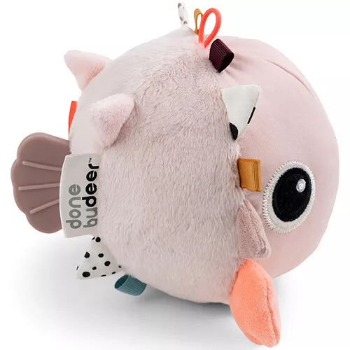 De innemende activiteitenknuffel ‘Puffee Rose’ van het Deense merk Done By Deer zit vol babyspeeltjes met verschillende geluidjes en texturen. Zijn siliconen staartvin fungeert als bijtring voor doorkomende tandjes. Leerzaam speelgoed voor nieuwsgierige baby’s.