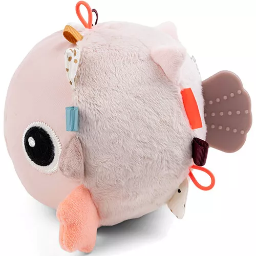 Door zijn ronde vorm kan de vissenknuffel goed rollen. Geef hem een duwtje en hij produceert een intrigerend geluid. Dit moedigt de baby aan om achter het activiteitenspeelgoed aan te kruipen.