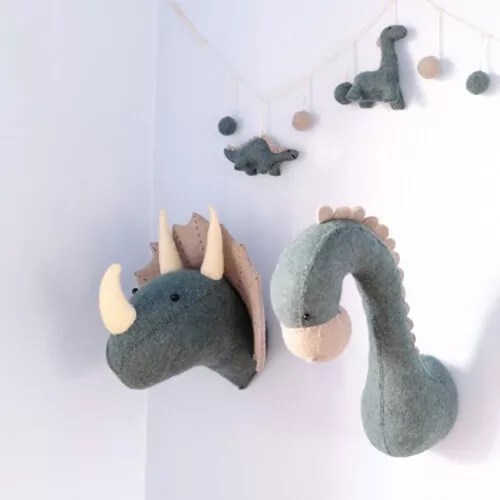 Een prehistorische dinosauruskop van een triceratops met spitse horens en imponerende kraag van wollen vilt, ontworpen door Fiona Walker. Een indrukwekkende eye-catcher voor in de speelkamer of kinderkamer.