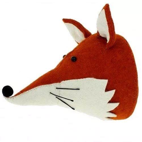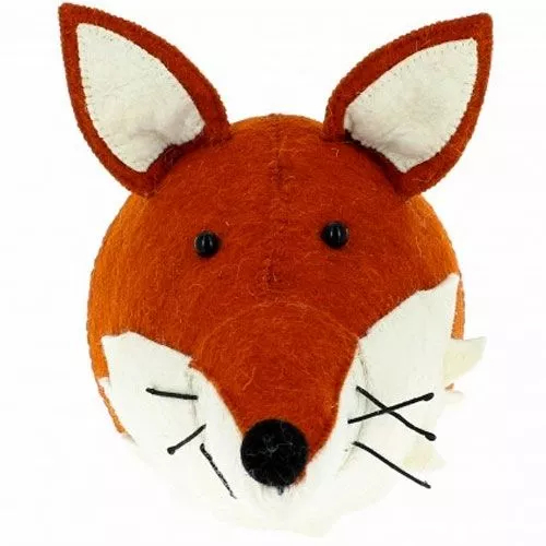 Deze vilten vossentronie in natuurgetrouwe kleuren – kastanjebruin en witte bef – heeft een spitse snuit met snuffelneus, twee gespitste oren, kraalogen en snorharen van ijzerdraad. Een aanwinst voor iedere kinderkamer, speelkamer of woonkamer. De wanddecoratie is eenvoudig aan de muur te bevestigen met een haak aan de achterzijde.