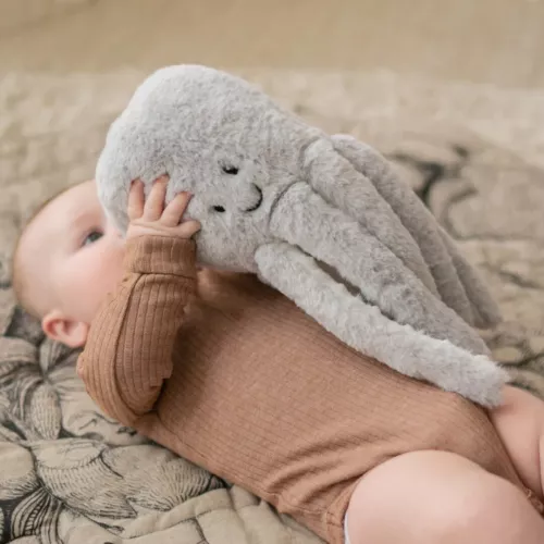 Deze trouwe hartslagknuffel ‘Olly – Heartbeat Comforter’ van het Nederlandse merk Flow Amsterdam sust de baby in slaap.