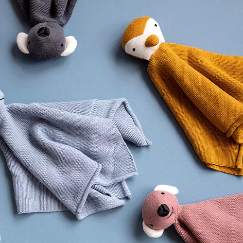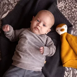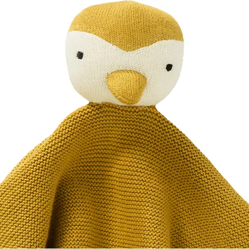 Een gebreid knuffeldoekje ‘Cuddle Cloth Pinguin’ van het Nederlandse merk Fresk om dichtbij te houden voor een knus en veilig gevoel.