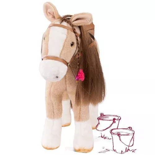 Een 6-delige set met de prachtige lichtbruine poppenpaard ‘Sparky’ van het Duitse merk Götz voor een paardenmeisje, dat niets liever doet dan tutten en frutten met de manen van haar paard.