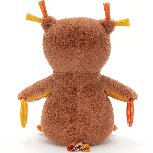 Met deze knuffeluil ‘Happihoop Owl’ van het Engelse merk Jellycat hebben baby’s plezier van een knuffel en speeltje in één. Met de bijtring een knuffel om in te bijten. Met plukjes en buikkwastjes valt van alles te ontdekken in deze vriendelijke uilenknuffel! En overal rammelletjes, kreukels en piepjes.