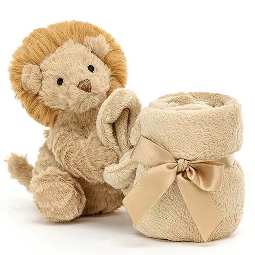 Deze ‘Fuddlewuddle Lion Soother’ van het Engelse merk Jellycat is een heerlijk knuffeldoekje voor kleine baby’s mèt knuffelleeuw. Het leeuwenknuffeltje heeft geborduurde oogjes en neus.