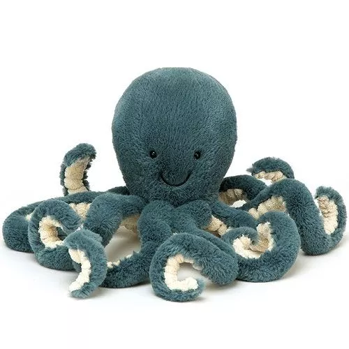 Deze blauwgroene ‘Storm Octopus’ van het Engelse merk Jellycat is fluweelzacht met kraalogen en een olijke glimlach. De onderkant van deze knuffeloctopus is roomwit en gemaakt van robuust corduroy. De acht tentakels zijn voorzien van elastiek en krullen heen en weer en op en neer. Een oogverblindende octopus om in de armen te sluiten en heerlijk mee te knuffelen, in te knijpen en aan te frutselen.