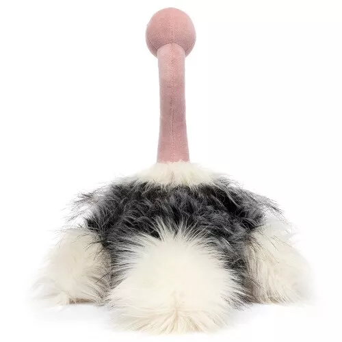 Knuffelvogel ‘Ramonda Ostrich’ van het Engelse merk Jellycat steelt de show met haar zwart-witte vacht en pluizig verenkleed. Aan haar lange poten kan deze slungelige knuffel makkelijk over mee naar toe genomen worden.