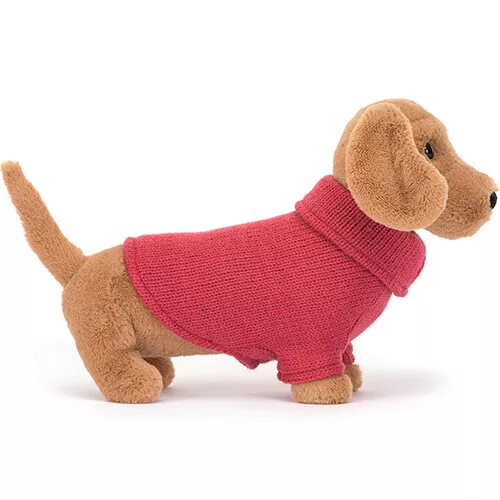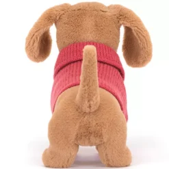 Het trouwe knuffelhondje ‘Sweater Sausage Dog Pink’ van het Engelse merk Jellycat is gekleed om indruk te maken. Deze zachte karamelkleurige viervoeter heeft een gebreide roze trui aan om zijn kleine buik lekker warm te houden. Met zijn lange hangoren heeft het hondenknuffeltje alleen oor voor zijn mensenvriendje.