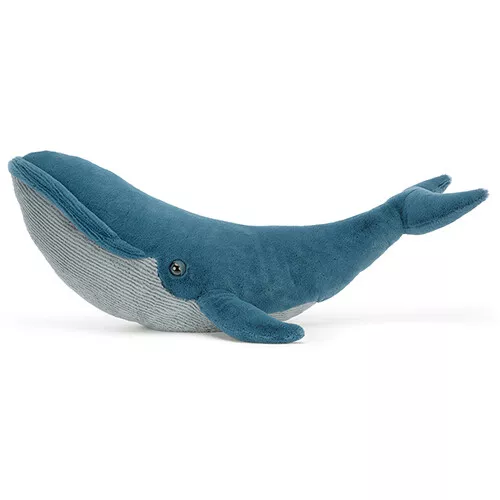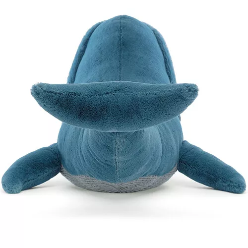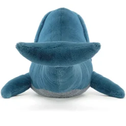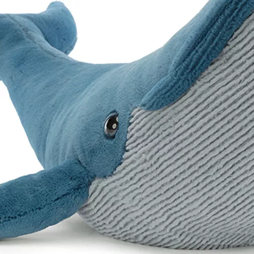 De speelgoedwalvis heeft een fluweelzachte blauwe vacht en een blauwgrijze, gestreepte buik van gekamde stof. De verschillende texturen voelen verrassend aan.
