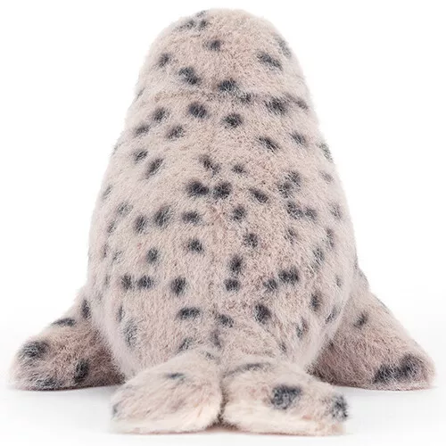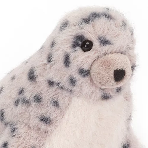 Een kleine knuffelzeehond ‘Nauticool Spotty Seal’ van het merk Jellycat met sproetjes. Met zijn bolle buikje, nieuwsgierige kraalogen en een fluweelzachte, gespikkelde vacht is dit speelgoedzeehondje onweerstaanbaar.