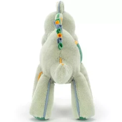 Het dinoknuffeltje bevat een rammelaar, knisperende delen om aan te frummelen en is voorzien van een spiegeltje dat in een gebreid zakje opgeborgen kan worden. De stekels op zijn hoofd zijn lusjes en onder zijn pootjes heeft hij stofjes met verschillende texturen. Een prehistorisch maatje voor kleine onderzoekers.
