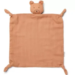 Twee zachte knuffeldoeken ‘Agnete cuddle cloth 2-pack – Tuscany rose / Golden caramel’ van het Deense merk Liewood om mee te tutten en frutten. De kop van de knuffelbeer heeft ronde oortjes en deze voelen prettig en vertrouwd aan. Een ideaal eerste knuffeltje voor kleine dromers.