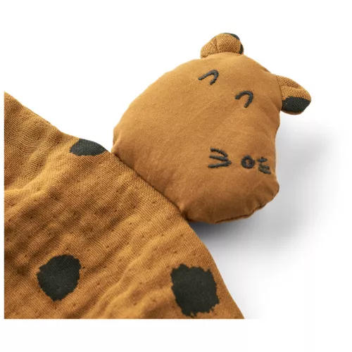 Een knuffeldoek ‘Amaya Cuddle Teddy – Leopard – Golden Caramel’ van het Deense merk Liewood om mee te tutten en frutten. Het bolle kopje van het luipaardknuffeltje voelt prettig en vertrouwd aan.