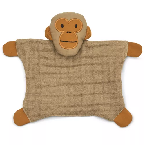 Een knuffeldoek ‘Amaya Cuddle Teddy – Monkey – Oat’ van het Deense merk Liewood om mee te tutten en frutten. Het bolle kopje van het apenknuffeltje voelt prettig en vertrouwd aan.