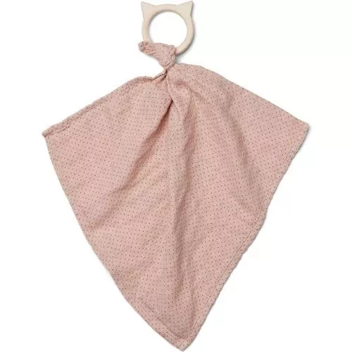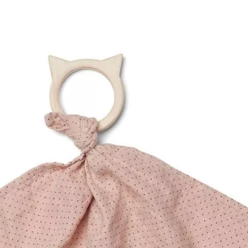 Een knuffeldoek aan een houten bijtring van het Deense merk Liewood. De beer-ring is licht en makkelijk vast te grijpen door kleine handjes.