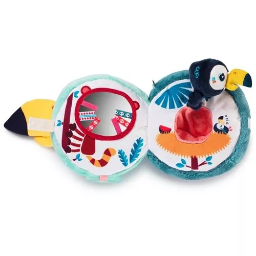 Vouw Pablo’s bolle buik open voor allerlei verrassingen: een kindveilig spiegeltje en een toekanknuffeltje. Het spelen met de activiteitenspeeltjes leert kinderen vormen herkennen en stimuleert de fijne motoriek wanneer zij de speelvormpjes weer op hun plaats leggen. De vele geluidjes, kleuren en texturen van de speelgoedknuffel zorgen voor een optimale stimulatie van de zintuigen.