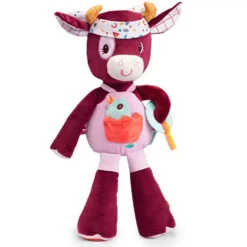 De koeienknuffel heeft speelse oortjes om aan te frummelen, een bijtring aan haar arm en een spiegeltje onder haar voet. Als ze zwaait met haar ronde poten rinkelt er een belletje. Uit het buideltje op haar buik komt een knuffelvogeltje tevoorschijn.