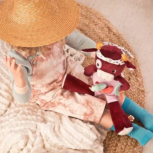 Deze bonte knuffelkoe Rosalie van het Belgische merk Lilliputiens weet nieuwsgierige baby’s te vermaken.