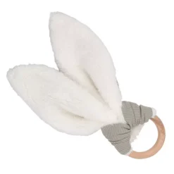 Een houten bijtring met stoffen konijnenoren ‘Bunny Teether – Abbey Stone’ van het Nederlandse merk Little Indians. De bijtring is licht en door de lange oren is de bijtring makkelijk vast te pakken door kleine handjes.
