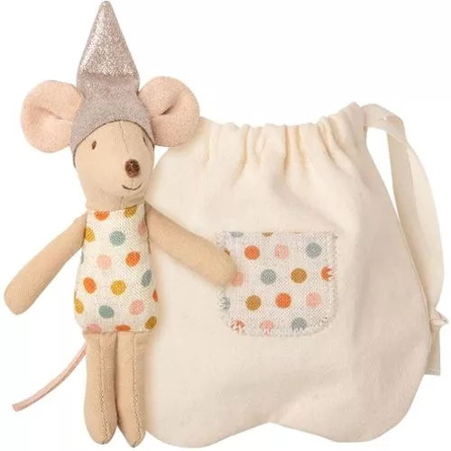 Een kleine knuffelmuis ‘Little Mouse Tooth Fairy’ met een bewaarzakje van het Deense merk Maileg. Het vertederende tandenfeemuisje past op de melktandjes die in het katoenen tandzakje veilig bewaard kunnen worden.