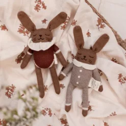 Voor de allerkleinsten een knuffelkonijntje ‘Bunny Soft Toy, Oat Jumpsuit’ van het Franse merk Main Sauvage. Met zijn grote oren en stijlvolle outfit is dit konijn een echte hartendief. De handgebreide lappenpop van baby alpaca wol draagt een grijze jumpsuit met wit kraagje.