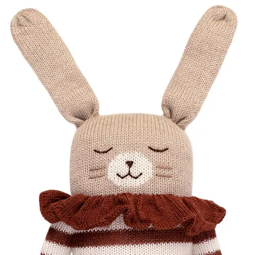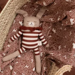 Een knuffelkonijn ‘Big Bunny Soft Toy, Sienna Striped Romper’ van het Franse merk Main Sauvage. Een konijn van flink formaat om heerlijk mee te knuffelen. De lappenpop van baby alpaca wol draagt een gestreept pakje met kraagje.