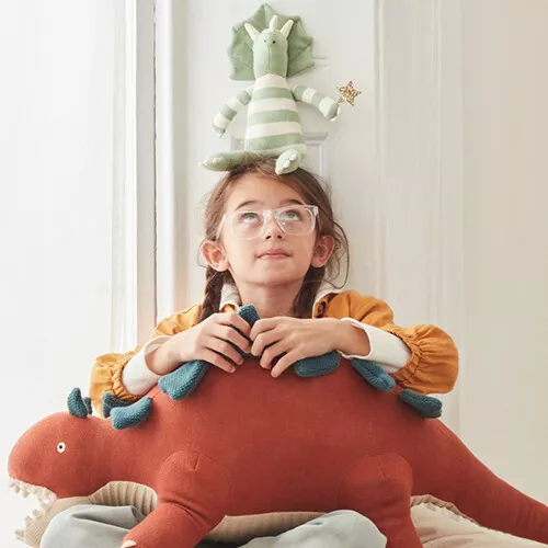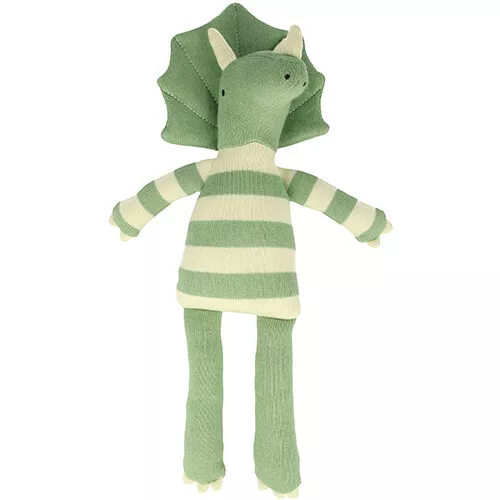 Knuffeldino ‘Max’ van het Engelse merk Meri Meri is een trouw kameraadje, die graag mee gaat op avontuur. De dinoknuffel heeft slungelige pootjes, een prachtige stekelkroon en een gebreid shirt met groene streepjes, dat niet uitgetrokken kan worden.