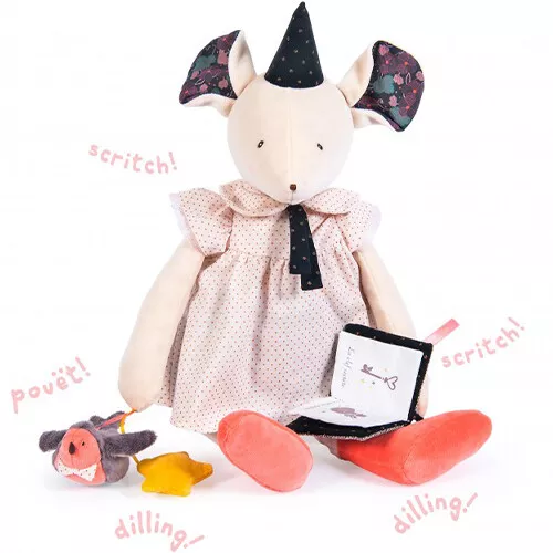 Deze aaibare activiteitenknuffel Mimi de muis uit de collectie ‘Il Était Une Fois’ van het Franse merk Moulin Roty prikkelt de zintuigen van de baby. De onweerstaanbare knuffelmuis heeft van alles om te ontdekken voor kleine handjes.