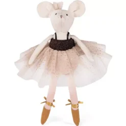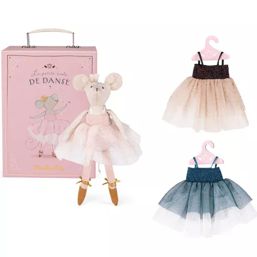De muizenknuffel draagt een roze tutu, heeft een bloemetje op haar bolletje en balletschoenen met gouden lintjes. In haar kledingkast heeft ze een houten rail met bijbehorende hangers, een spiegel en twee andere balletjurkjes. De jurkjes hebben een rok van tule met glittertjes, elk in een andere kleur. Klaar voor elke gelegenheid!