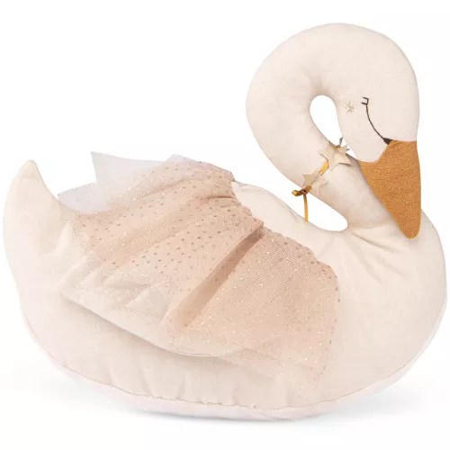 De zwanenknuffel van chambray heeft vleugels van tule met glinsterende pailletten en om haar lange hals een ketting met gouden sterren.