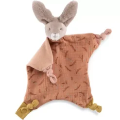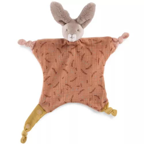 Een knuffeldoek ‘Clay’ uit de serie ‘Trois Petit Lapins’ van het Franse merk Moulin Roty om mee te tutten en te frutten. Het babydoekje met konijnenknuffeltje voelt prettig aan en geeft houvast. Aan het lieflijke konijnendoekje kan een speen worden bevestigd waardoor het ook fungeert als speendoek.
