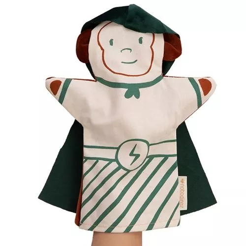 Deze ‘Monkey Hand Puppet’ van het Spaanse merk Nobodinoz is de Robin Hood van de poppenshow. De stoffen handpop in speels, drie-kleurig design heeft een fluweelzachte, bruine rug en een even zachte groene cape met capuchon. De speelgoedpop is zowel geschikt voor kinderhanden als voor volwassen handen. De cape en capuchon zitten vast aan de apenpop en kunnen niet afgedaan worden.