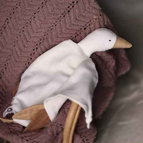 Zoeken naar de speen is niet meer nodig met dit zachte speendoekje met gans ‘Cuddle Cloth Goose – Silver Grey’ van het Deense merk Saga Copenhagen.