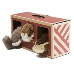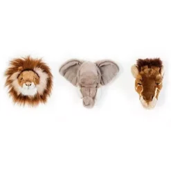 Drie kleine safari dierenkoppen van het merk Wild & Soft, prachtig uitgevoerd met pluche vacht en kraalogen. De olifantenkop heeft stoffen slagtanden, de leeuw uitbundige manen en de giraf heeft olijke pluisjes op zijn hoorntjes.